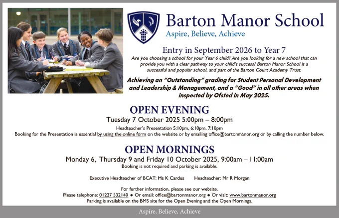 It is expected that a joint Sixth Form provision with Barton Court Grammar School is developed with Barton Court providing a centre of excellence for academic courses and Barton Manor School a centre of excellence for vocational courses. Students will be able to enrol easily at either School and/or study courses at both Schools with a combination of both academic and vocational courses if they wish. As the two Schools are almost co-sited, within easy walking distance of each other and will have common timetables, students and teachers will be able to easily move between the two sites.